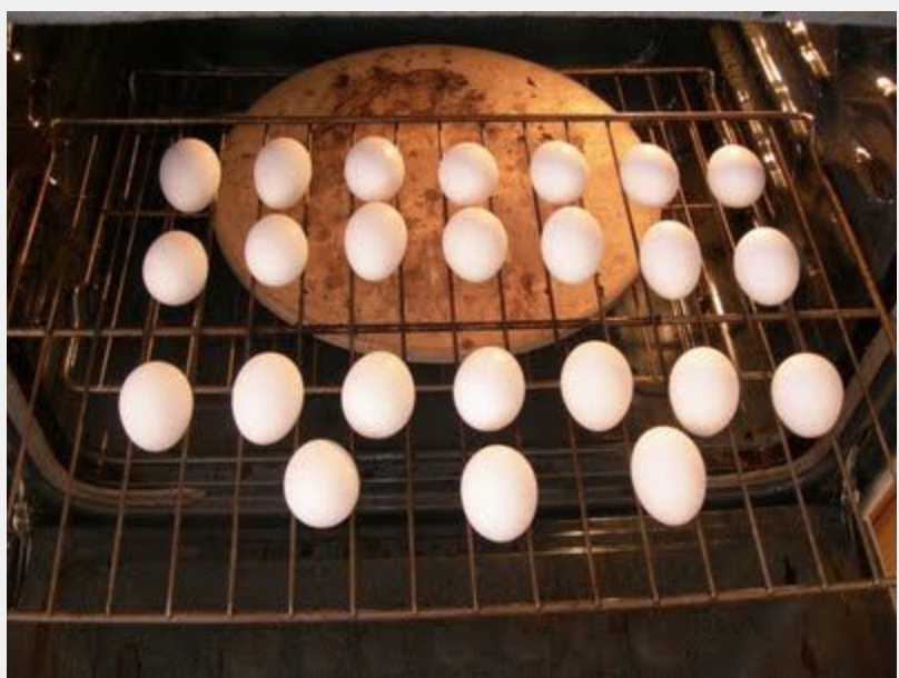 I started out with my eggs in the oven and then I remembered to put a baking sheet underneath of them, thankfully. The blog post linked above says that you should put the baking sheet underneath in case any of your egg shells break.